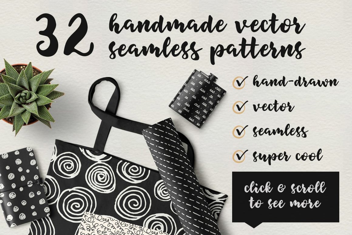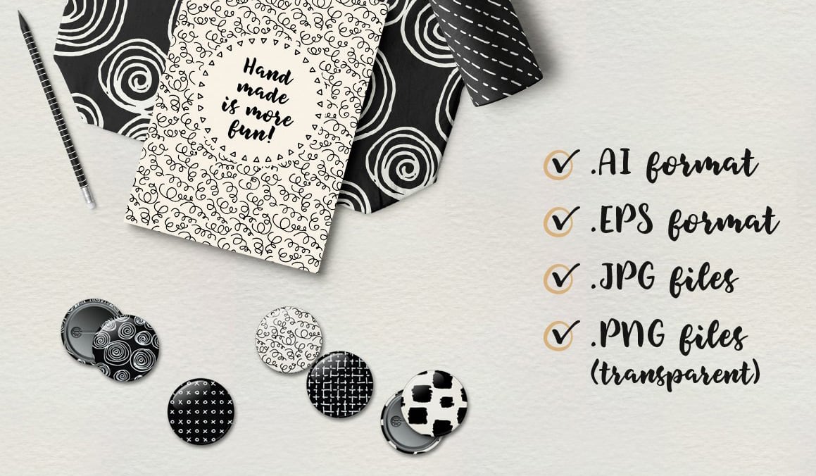 Use Das Handy! to infuse your designs with a punch of personality and coolness! All patterns come with a default black color. You can use Illustrator or Photoshop to customize foreground and background colors, adjust dimensions and directions, as you see fit, easily and quickly.